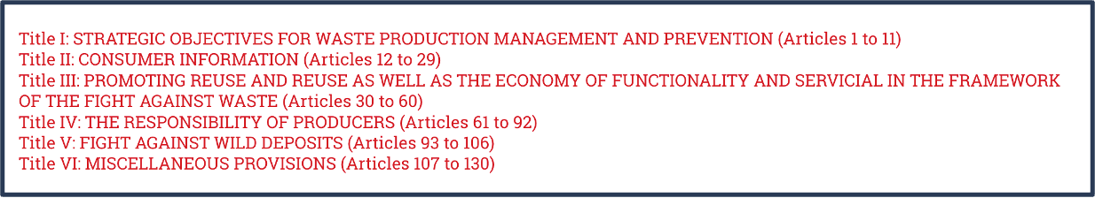 2020년 2월 10일, 프랑스 의회와 상원은 폐기물의 일반적인 감소와 순환 경제를 촉진하는 법률 2020-105호를 채택했습니다. (Law n° 2020-105)
