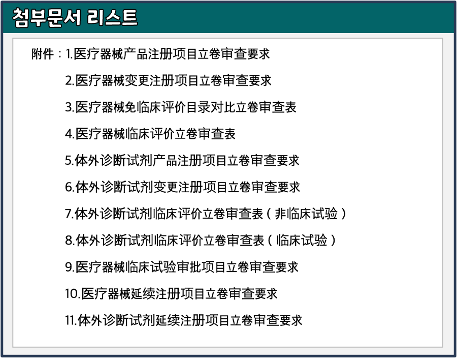중국 의료기기 "의료기기 등록 및 등록에 대한 관리 조치"(총무처 명령 번호 48)에 따라 의료기기와 관련된 다양한 개정안이 발표되었습니다. 이번에 발표된 첨부문서만 11개입니다. NMPA(국가약품감독관리국) 의료기기기술심의센터는 접수링크의 수정된 제출심사요건에 따라 해당 신청서의 신청자료를 검토하고, 제출하는 신청자료의 완전성, 적합성 및 일관성을 검토하게 됩니다.