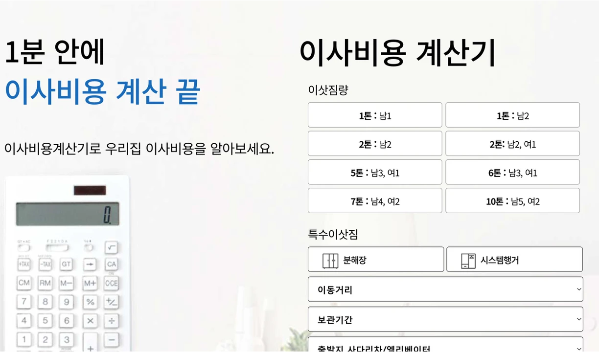 거기다 1분 안에 이사비용을 계산해볼 수 있는 계산기 서비스가 있습니다.